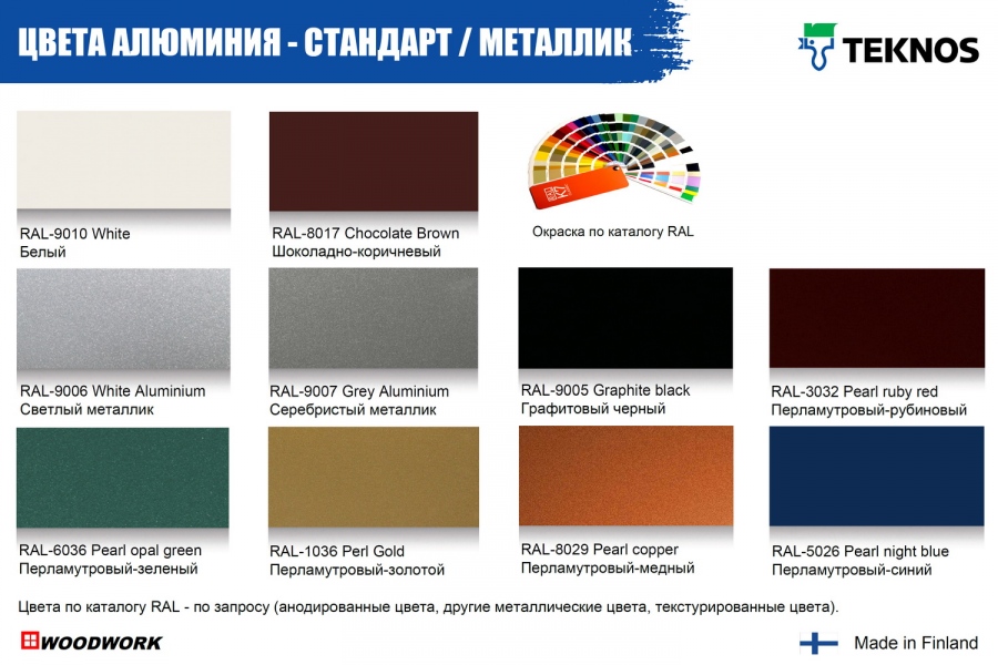 Вам предлагается широкая палитра как стандартных прозрачных цветов окраски окон из сосны и окон из дуба: 9 прозрачных и 2 непрозрачных стандартных цвета (RAL-9010, 8017), также любой цвет по каталогу RAL. Для окраски алюминиевых поверхностей предлагаются стандартных цвета (RAL-9010, 8017), палитра цветов (глянцевые, матовые, металлик) по каталогу RAL.