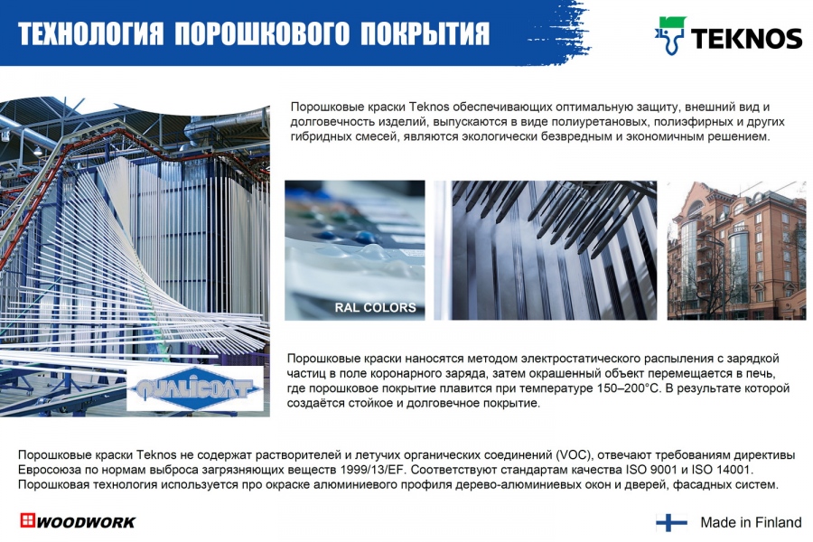 Порошковые краски Teknos не содержат растворителей и летучих органических соединений (VOC), отвечают требованиям директивы Евросоюза по нормам выброса загрязняющих веществ 1999/13/EF. Соответствуют стандартам качества ISO 9001 и ISO 14001. Порошковая технология используется про окраске алюминиевого профиля дерево-алюминиевых окон и дверей, фасадных систем.