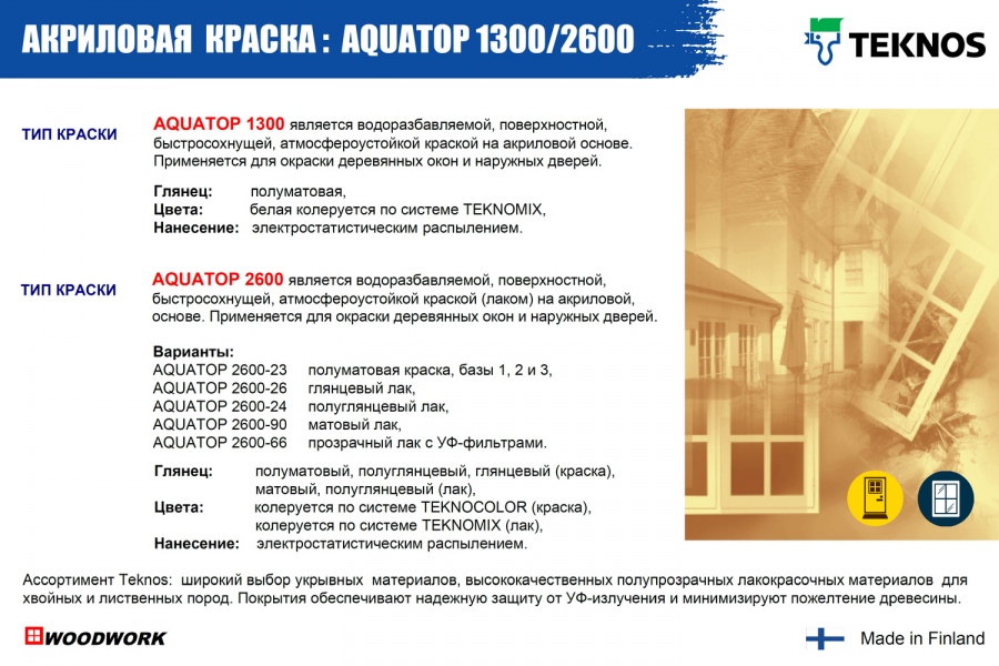 Teknos предлагает системы укрывных и лессирующих покрытий, которые используются для окраски финских деревянных окон и балконных дверей: