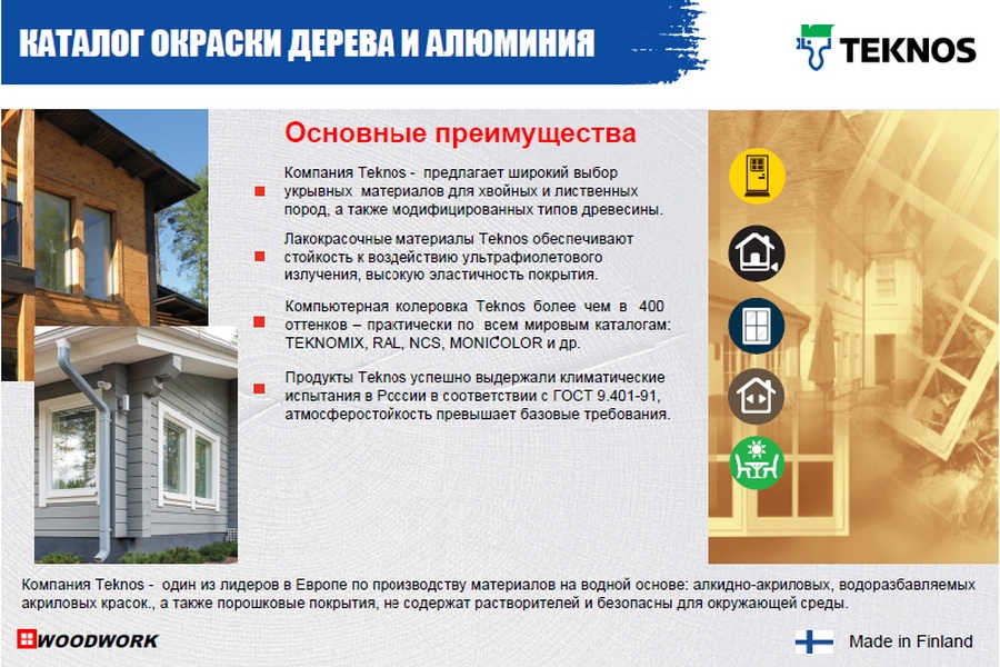 Широкий выбор укрывных материалов Teknos для хвойных и лиственных пород, а также модифицированных типов древесины, лакокрасочные материалы Teknos обеспечивают стойкость к воздействию ультрафиолетового излучения, высокую эластичность покрытия.