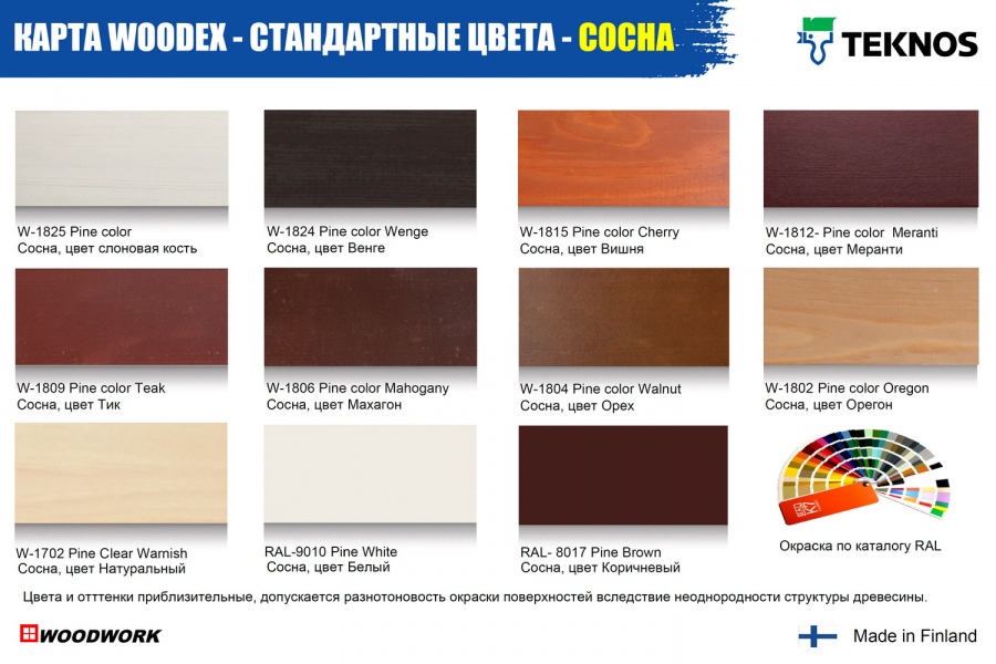 Большой выбор цветов окраски древесины, лессирующие и укрывные покрытия.