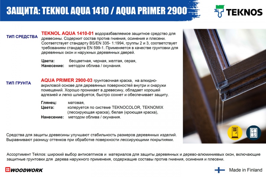Покрытия Teknos предназначены для работы в сочетании с различными материалами и могут менять свойства некоторых видов древесины. Ассортимент грунтовочных материалов Teknos позволяет решать проблемы, характерные при работе с древесиной, например, пожелтение в местах сучков в хвойной древесине, блокирование выхода танинов из древесины дуба и др.