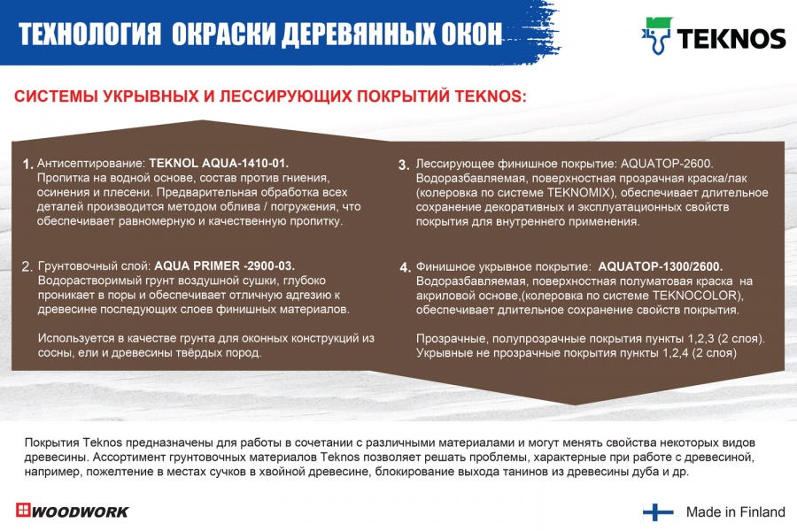 Продукция Теknos производится в Финляндии с использованием только высококачественного сырья, что в свою очередь при правильном использовании обеспечивает высокий уровень финишного покрытия.