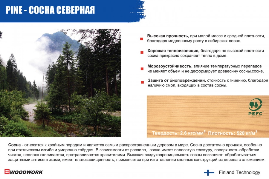 Сосна - относится к хвойным породам малой плотности, достаточно прочная, особенно при статическом изгибе и умеренно твёрдая. Древесина сосны, в зависимости от распила, имеет полосатую текстуру, даёт чистую поверхность обработки, неплохо склеивается, протравливается красителями. Высокая воздухопроницаемость сосны позволяет хорошо обрабатываться защитными антисептиками, имеет стойкость против гниения и влагозащищенность. Сосна применяется при изготовлении окон и фасадных конструкций из дерева с алюминием.