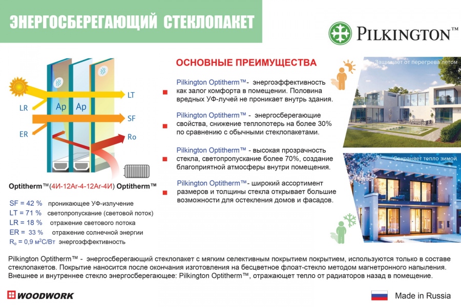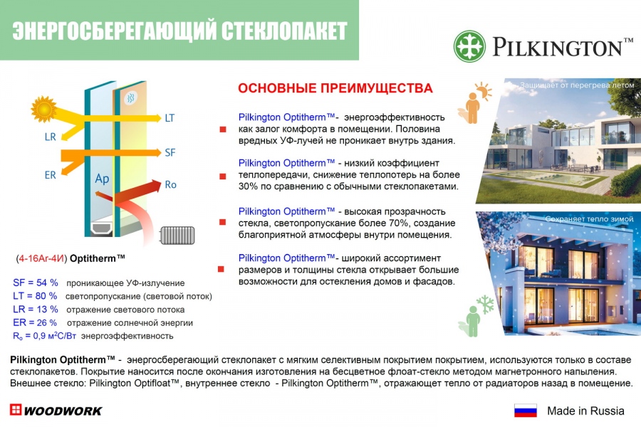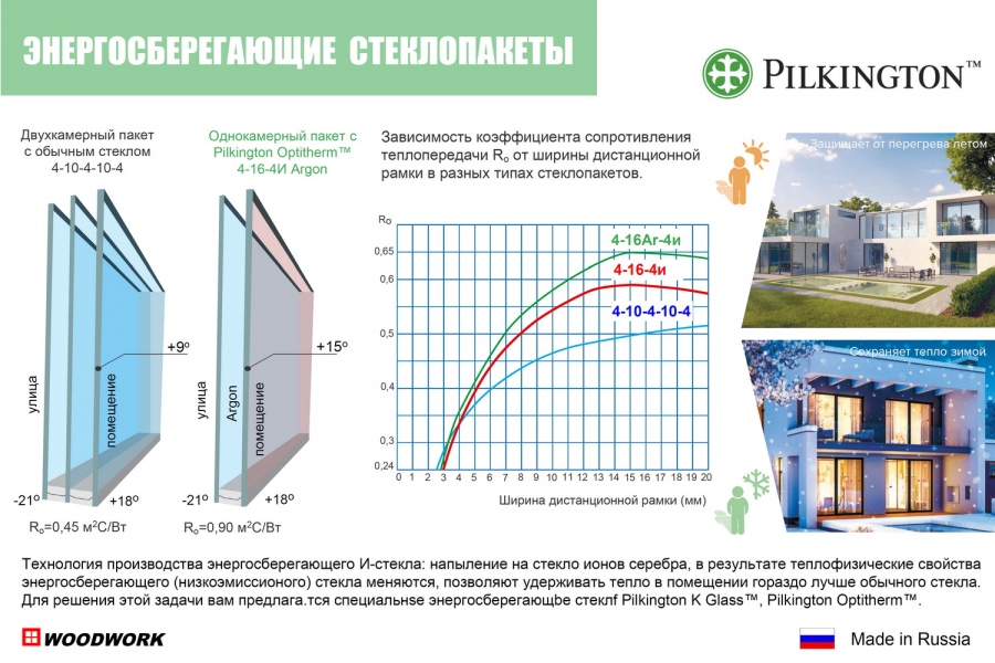 Энергосберегающие стеклопакеты: общепринятое перечисление в определенной последовательности конструктивной формулы стеклопакета принято обозначать толщиной стекла и дистанционной рамки (мм). Первое стекло - высококачественное полированное стекло марки М1, второе – специальное энергосберегающее стекло с усиленными теплоизоляционными свойствами: Pilkington K Glass™, Pilkington Optitherm™ SN. Энергосберегающее стекло имеет специальное низкоэмиссионное покрытие из ионов серебра, отражающее тепловое излучение от батарей и радиаторов обратно в помещение.