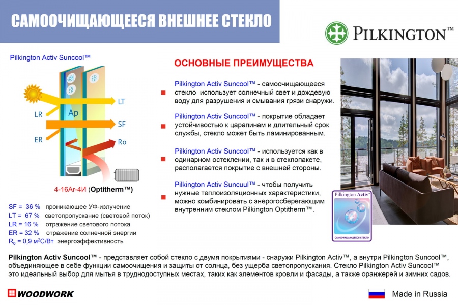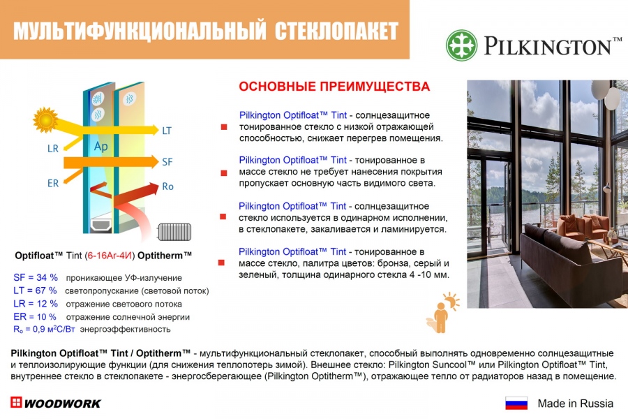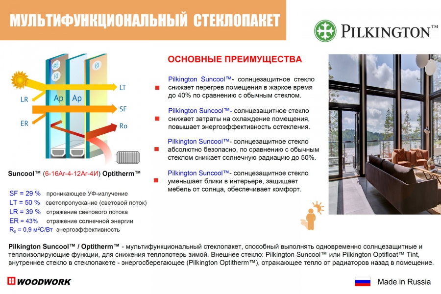 Солнцезащитные стеклопакеты: отличные характеристики при сохранении высокой степени прозрачности и светопропускания и великолепной теплоизоляцией. Экономия на отоплении зимой, на кондиционировании летом и непревзойденный комфорт на протяжении всего года. Широкая гамма стекол Pilkington Suncool™, PilkingtonOptifloat™ Tinted с различными оттенками, предлагаются в сочетании с самоочищающимся покрытием Pilkington Aktiv™.