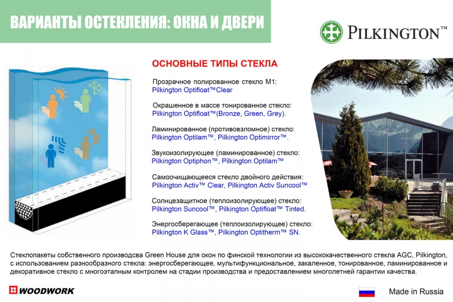 Стеклопакет состоит из двух или трех листов стекла, соединенных между собой по контуру с помощью дистанционных рамок и герметиков, образующих герметически замкнутые камеры, заполненные осушенным воздухом или другим газом. Современные стеклопакеты отвечает всем жестким требованиям санитарных норм жилых и общественных помещений и соответствуют ГОСТ 111-2001. Для окон из дерева и алюминия используется прозрачное полированное стекло М1, высокого качества Pilkington Optifloat™Clear. Для фасадного остекления предлагается декоративное полупрозрачное стекло, ламинированное или окрашенное в массе Pilkington Optifloat™(Bronze, Green, Grey).