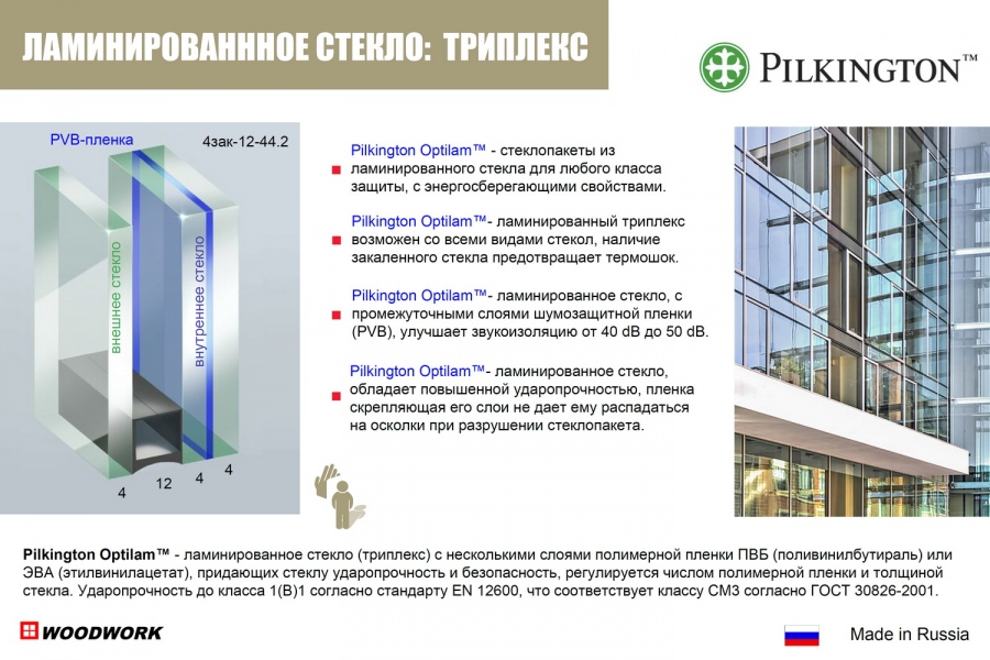 Pilkington Optilam™: ламинированное стекло (триплекс) с несколькими слоями полимерной пленки ПВБ (поливинилбутираль) или ЭВА (этилвинилацетат), придающих стеклу ударопрочность и безопасность до класса 1(В)1 согласно стандарту EN 12600. Состав ламинированного стекла и число промежуточных слоев определяют степень для улучшения функций: солнцезащиты, энергосбережения, безопасности, декоративности при остеклении фасадов, используются для любого класса защиты, имеют энергосберегающие свойства.