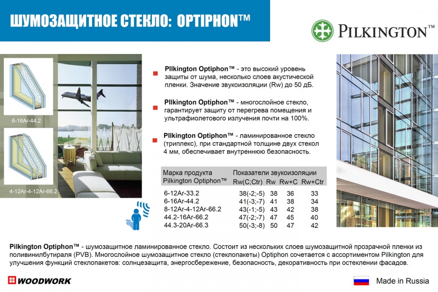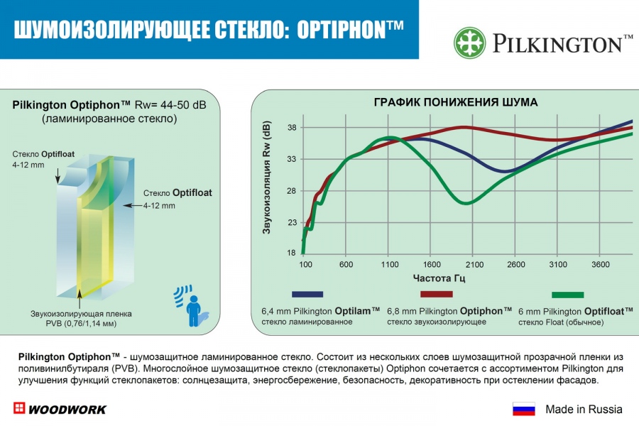 Pilkington Optiphon™: - шумозащитное ламинированное стекло. Состоит из нескольких слоев шумозащитной прозрачной пленки из поливинилбутираля (PVB). Многослойное шумозащитное стекло (стеклопакеты) Optiphon сочетается с ассортиментом продукции Pilkington для улучшения функций стеклопакетов: солнцезащита, энергосбережение, безопасность, декоративность при остеклении фасадов. Значение звукоизоляции (Rw) до 50 дБ.