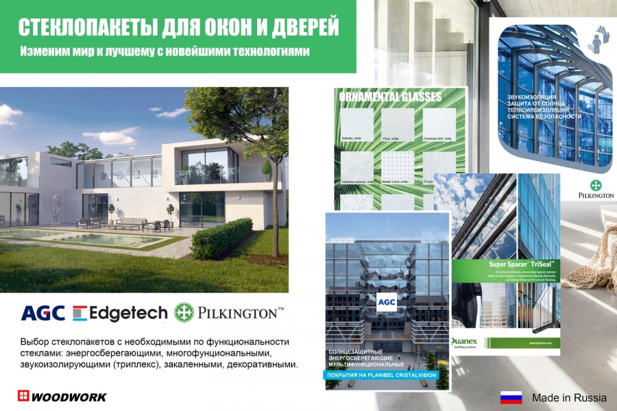 Шведская оконная компания SSC Joinex предлагает стекла и стеклопакеты из высококачественного стекла AGC, Pilkington, с использованием разнообразных видов стекла. Однокамерные и двухкамерные стеклопакеты сложной геометрической формы, с расстекловкой: энергосберегающее, мультифункциональное, закаленное, тонированное, ламинированное и декоративное стекло с многоэтапным контролем на стадии производства и предоставлением многолетней гарантии качества.