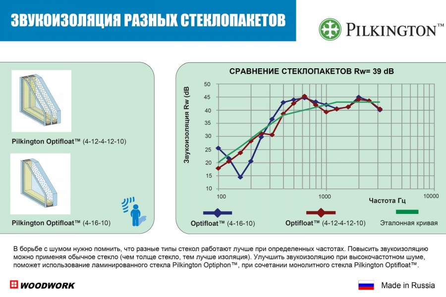 4) использование в конструкции стеклопакета звукоизолирующего ламинированного стекла Pilkington Optiphon™, обеспечивает высокий уровень защиты от шума.