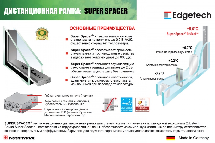 Super Spacer® это инновационная дистанционная рамка для стеклопакетов, изготовлена по канадской технологии Edgetech. Рамка Super Spacer – изготовлена из структурированной пены, обеспечивает максимальную изоляцию по периметру стеклопакетов, оснащена непрерывным диффузионным барьером для водяного пара, максимально увеличивают показатели герметичности окна. Для еще большей теплоизоляции внутрь стеклопакета закачан инертный газ – аргон, замедляющий конвекцию воздуха внутри камеры стеклопакета и замедляющий процесс охлаждения камеры.