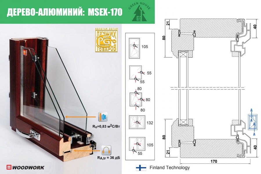 Оконные аксессуары: деревянные доборы и угловые деревянные колонны финского окна с внешним алюминием,фрамужные механизмы типа GEZE, встроенные межрамные жалюзи (управление на створке ручное или от пульта ДУ), деревянные подоконники и деревянные наличники из клееного бруса (сосна, дуб), вентиляционный клапан клапана для дополнительного притока воздуха, рамочная москитная сетка (съемная), защита от детей на оконных створках.