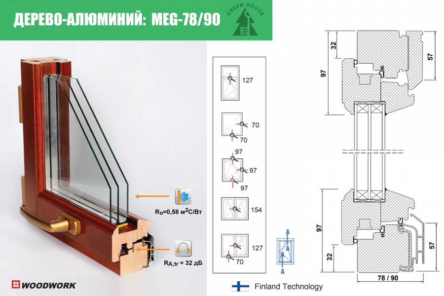 Оконные аксессуары: деревянные доборы и угловые деревянные колонны финского окна с внешним алюминием, фрамужные механизмы типа GEZE, деревянные подоконники и деревянные наличники из клееного бруса (сосна, дуб), вентиляционный клапан клапана для дополнительного притока воздуха, москитные сетки рамочные или рулонные, защита от детей на оконных створках.