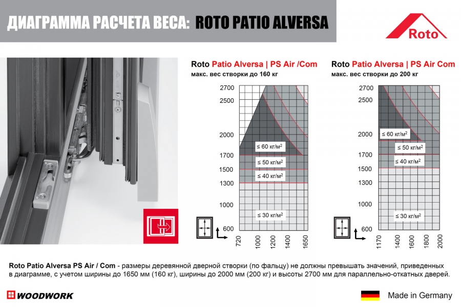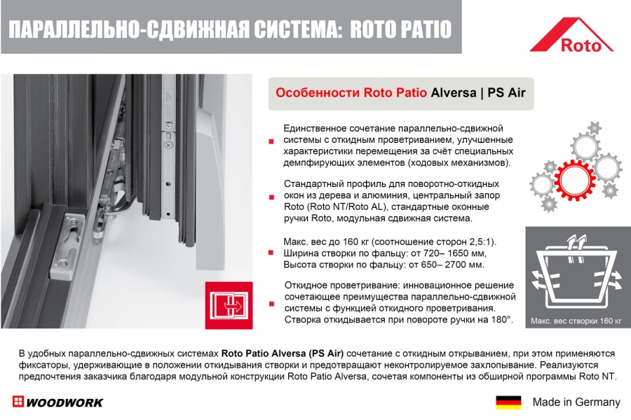 Roto Patio Alversa (РS Air) - параллельно-сдвижные системы, сочетание с откидным открыванием, при этом применяются фиксаторы, удерживающие в положении откидывания створки и предотвращают неконтролируемое захлопывание. Реализуются предпочтения заказчика благодаря модульной конструкции Roto Patio Alversa, сочетая компоненты из обширной программы Roto NT.