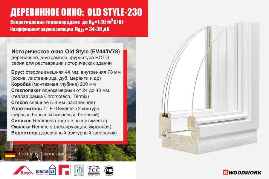 Серия «Old Style» - стилизацию современного окна под историческое деревянное окно: одностворчатое, открывающееся внутрь, с двойным или тройным стеклопакетом, изготавливается из 3-х или 4-х слойного клееного бруса толщиной 78х78 мм. Технология производства окон на базе современной немецкой системы IV-78 Holz Fenster.