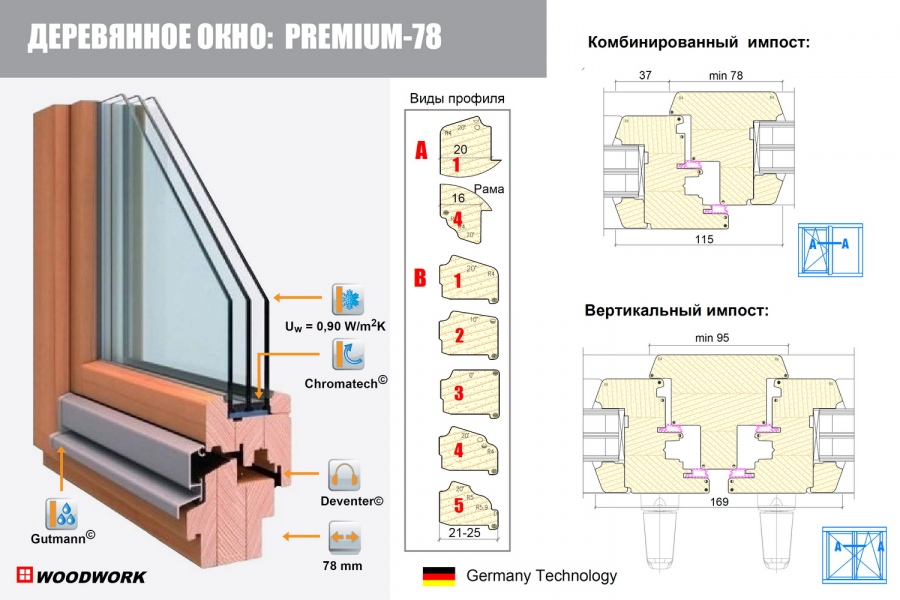 Профиль: 78х78 – 3 или 4-х слойный клееный брус (сосна, лиственница, дуб, меранти и др), система фиксации угловых клеевых соединений створки/коробки – деревянные шканты (бирони). Преимущества: максимальная герметичность и чистота обработки, крепление встык для врезных импостов, при соединении деталей под углом. Эстетический результат: лучшее соединение оконных элементов, без выхода шипа на поверхность изделия.