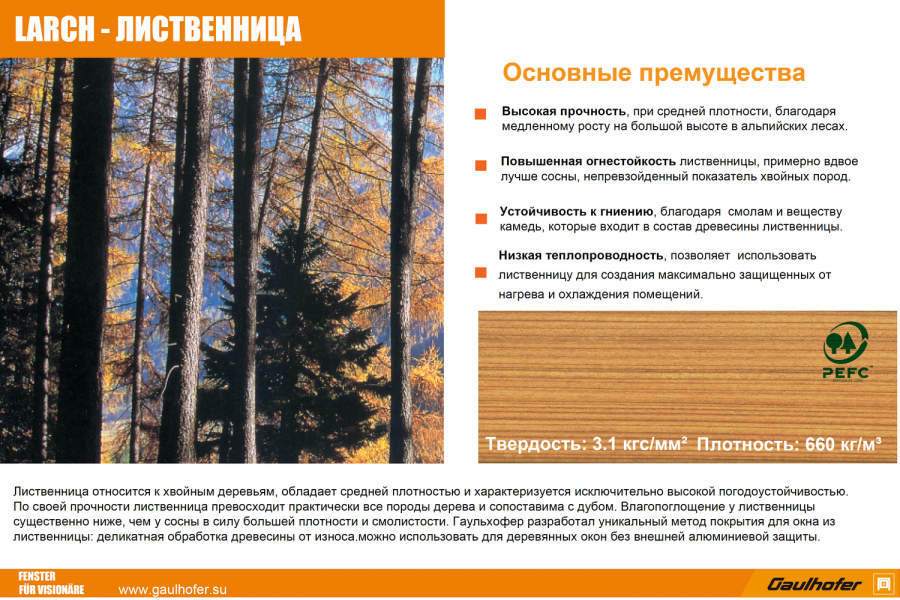Лиственница - относится к хвойным деревьям, обладает средней плотности и характеризуется исключительно высокой погодоустойчивостью, является самым износостойким хвойным деревом в Европе. По своей прочности древесина лиственницы превосходит практически все породы дерева и сопоставима с дубом. При использовании защитных покрытий лиственница практически не меняют влажности, можно использовать для деревянных окон без внешней алюминиевой защиты.