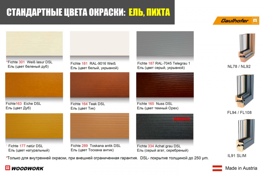 Вам предлагается широкая палитра как стандартных прозрачных цветов окраски окон из ели, окон из пихты, окон их лиственницы, окон из дуба и меранти: 20 лессирующих (полупрозрачных) покрытий, а также 3 непрозрачных укрывных стандартных цвета RAL-9016 (белый), RAL-7045 (cерый), RAL-6005 (зеленый), или любой цвет по каталогу RAL. Возможен подбор цвета по образцу заказчика, браширование, двухцветная отделка, обработка маслом и т.п.