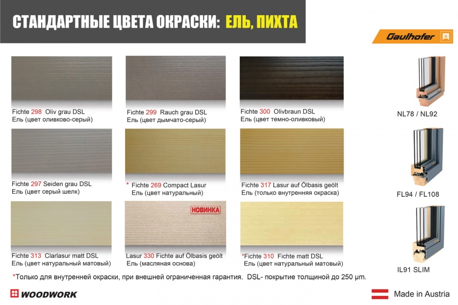 Active protection - новая инновационная технология защиты, которую использует австрийская компания Gaulhofer при окраске окон, является надежным средством защиты древесины. Двухфазная обработка поверхностей сохраняет окна и двери в идеальном виде, они будут выглядеть как новые в течение длительного времени. В ассортименте большое разнообразие цветов для дерева, которые имеют в составе специальный ресистент для высокой погодоустойчивости и стойкость против ультрафиолета.