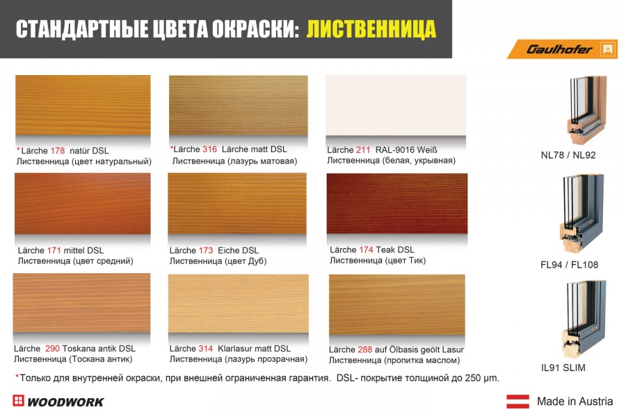 Большой выбор цветов окраски древесины, широкая палитра цветов для алюминия.