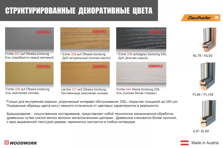 Обращаем внимание, что с 2021 г. предлагается новая категория декоративных цветов: браширование (искусственное состаривание), представляющее собой технологию механической обработки древесины путем снятия мягких волокон. Улучшаются эксплуатационные характеристики, древесина после обработки становится более прочной, устойчивой к воздействию влаги. Благодаря технологии структурирования и искусственного состаривания древесины окон и дверей, интерьер приобретает самобытность и уникальность.