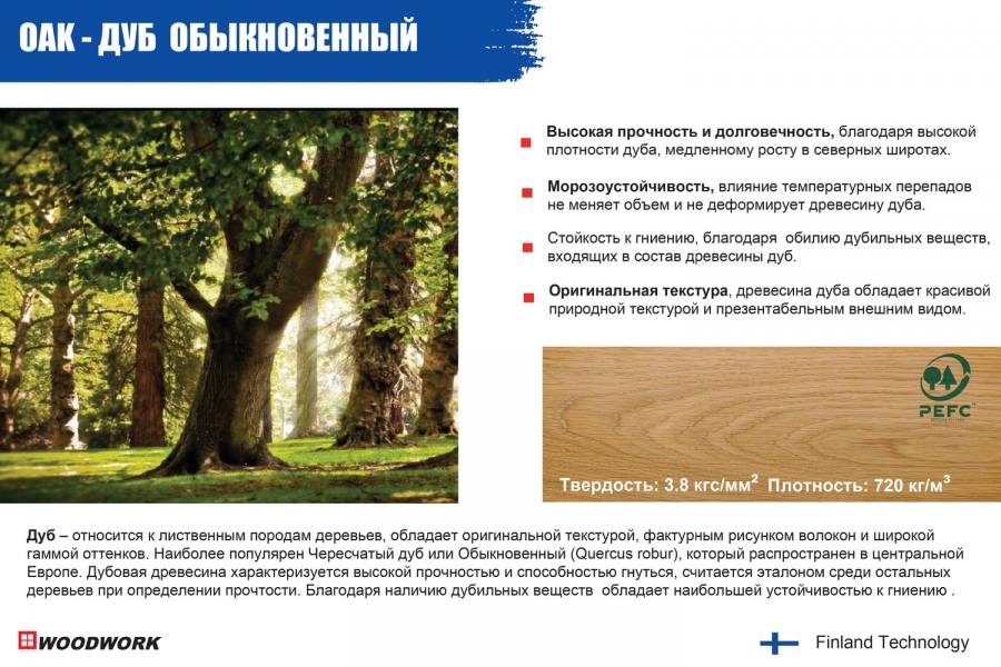 Дуб – относится к лиственным породам деревьев, обладает оригинальной текстурой, фактурным рисунком волокон и широкой гаммой оттенков. Наиболее популярен дуб Oбыкновенный (Quercus robur), который распространен в центральной Европе. Дубовая древесина характеризуется высокой прочностью, считается эталоном среди остальных деревьев при определении прочтости. Благодаря наличию дубильных веществ обладает наибольшей устойчивостью к гниению по сравнению со всеми лиственными породами.