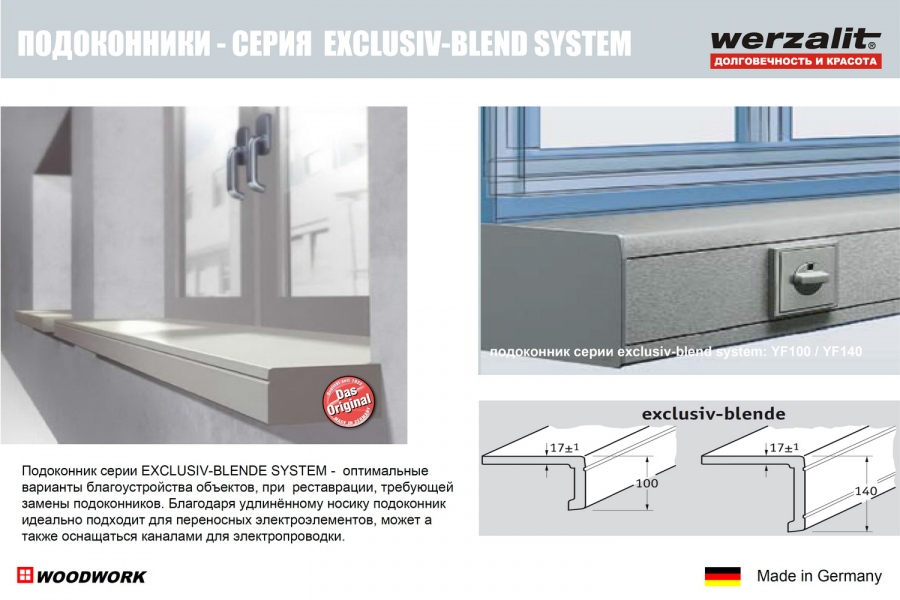 Подоконники Werzalit Exclusiv это классическая серия с типичным интегрированным капиносом (34 мм), которая имеется в продаже в качестве стандартного подоконника или подоконника серии System. Благодаря уникальным свойствам материала, таким как прочность, устойчивость к деформации, простота в уходе, этот подоконник хорошо зарекомендовал себя как на частных, так и общественных объектах.